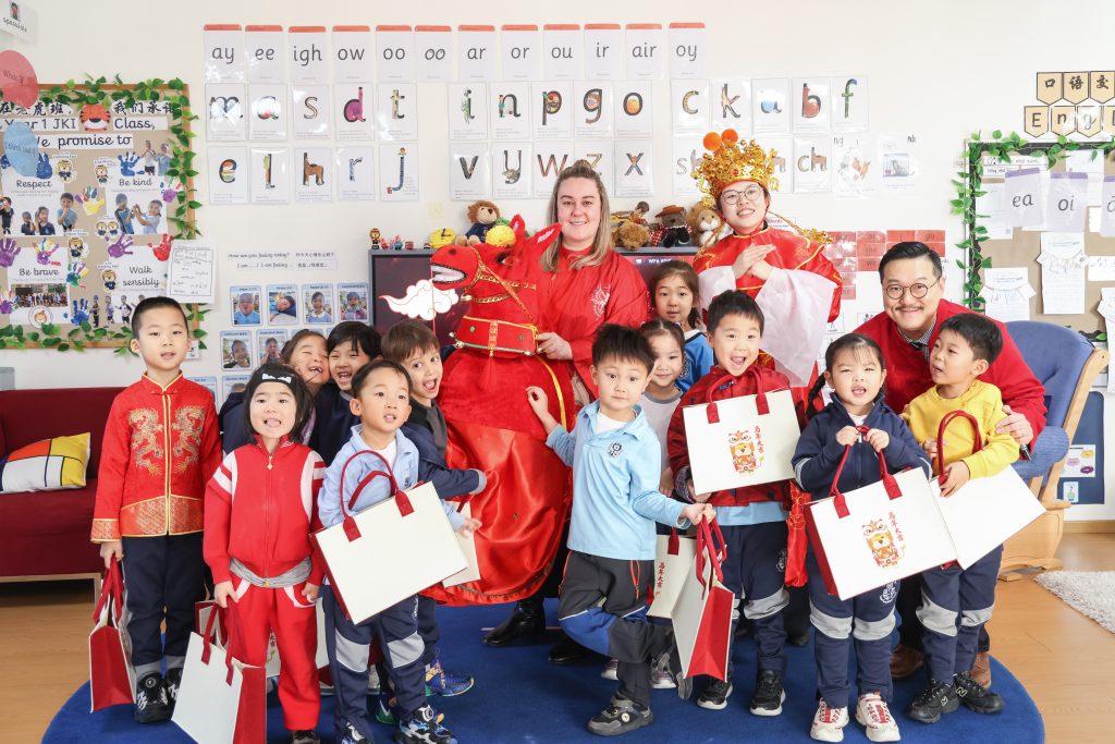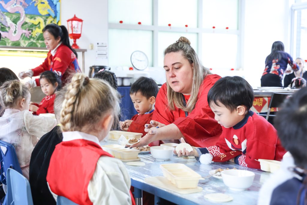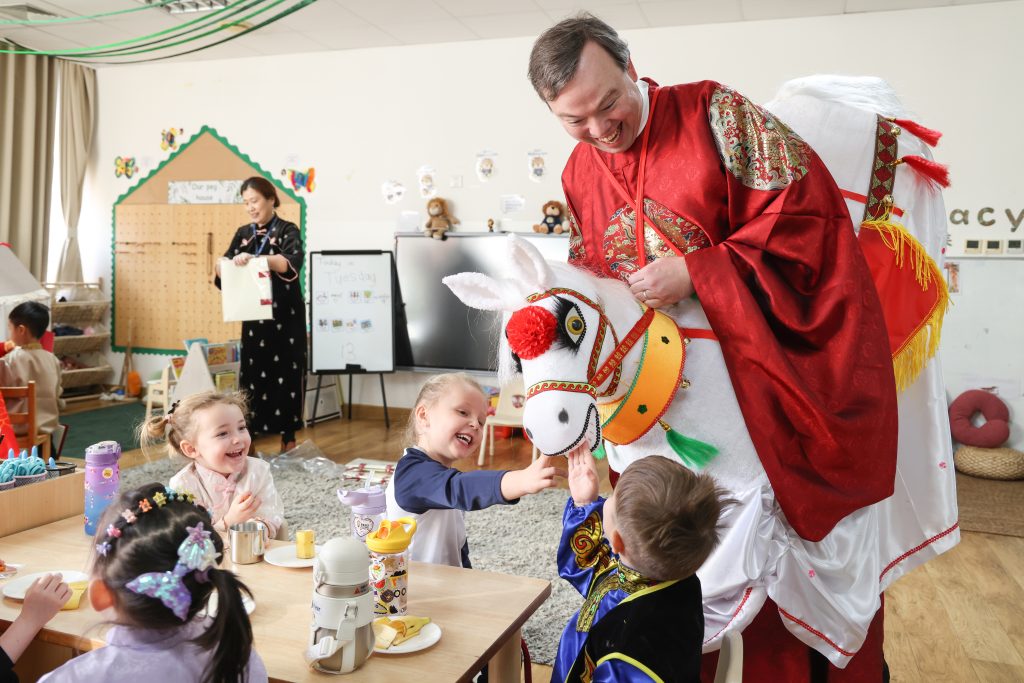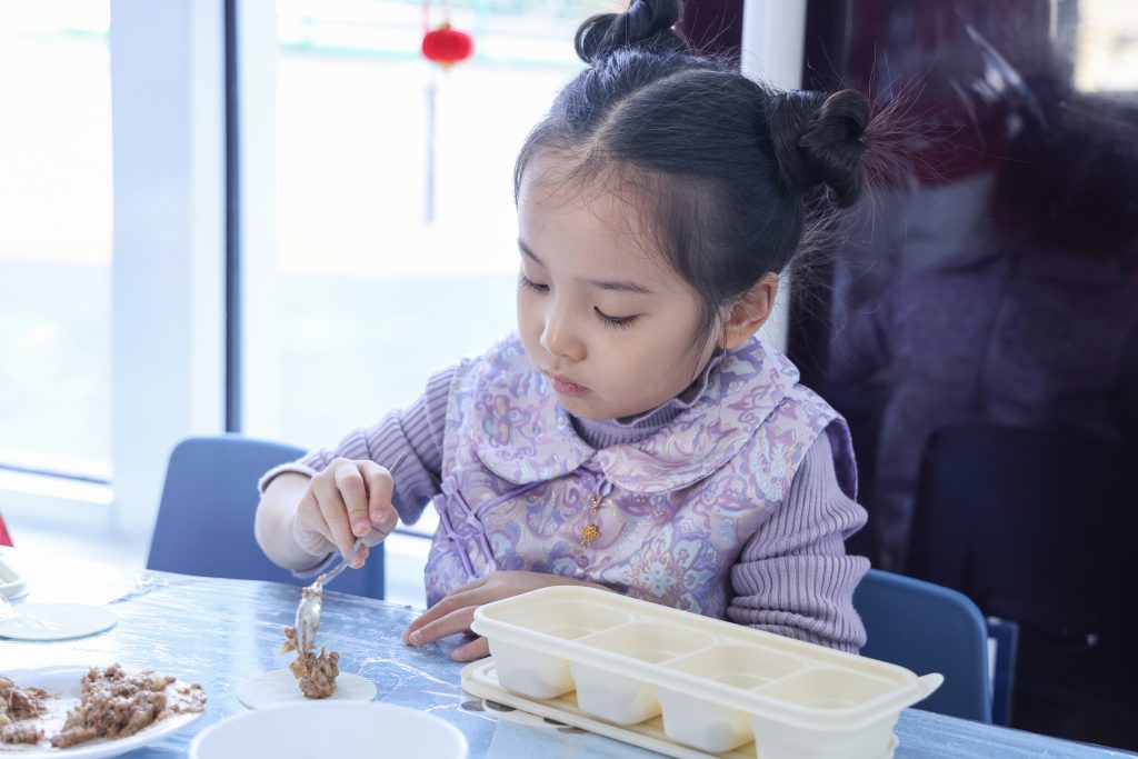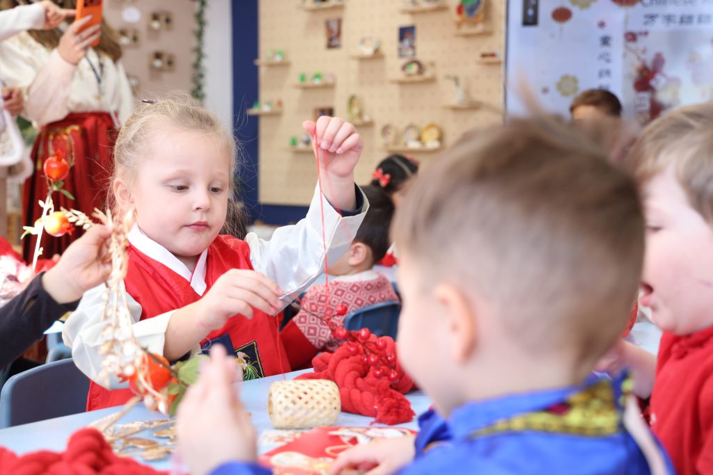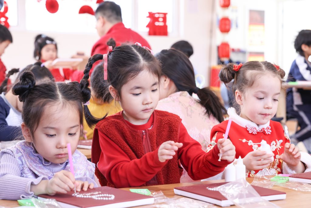 As the New Year approaches, the festive flavor grows stronger. To let children feel the celebratory atmosphere of the Chinese New Year, the Kindergarten launched Chinese New Year themed activities. During the activities, children experienced making dumplings, feeling the joy of reunion and sharing through kneading and wrapping; subsequently, they decorated the “Wanzi” knots symbolizing auspiciousness, experiencing the charm of traditional handicrafts. In the art creation session, children in the Pre-Nursery and Nursery classes completed Song Brocade Horse collages, while children in Reception and Year 1 made pearl collage paintings; through these activities, the children learned about traditional patterns and used sparkling colors to express beautiful wishes for the New Year.