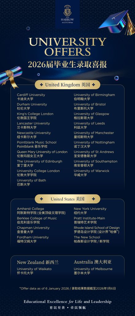 The results as of January 6th are but a magnificent opening chapter. From the ancient hallowed halls of the UK to the innovative pioneers of the US, Harrow Beijing graduates are lighting up their own stars on the global map. We are immensely proud of our students who have received their offers, and we wish every Harrovian continued success in the upcoming decision season as they open the doors to their dream universities and head toward an even wider world!